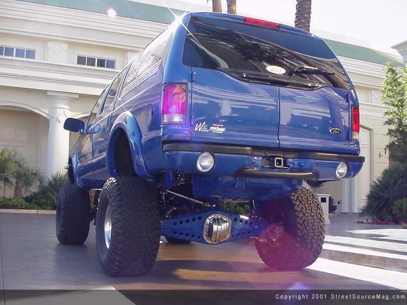 To change the overall appearance of this monsterous Excursion, John changed many things. Starting with the front, John went with a Trenz billet grille. Next, John took the stock front bumper, smoothed it out and frenched in a set of PIAA lights. To help the mean off road look of his ride, a Reaper Racing Banshee light bar was installed. To provide a clean look, Auto Indulgence super whites where installed.  Working his way back to the rear, a set of Bush Walker fender flares where mounted up.