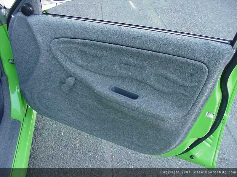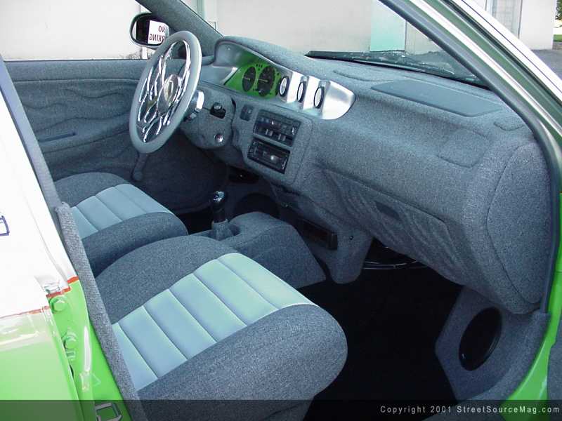 While torn apart, Jason figured that was a good time to pull apart other items throughout the undercarriage to be painted and powder coated. The new suspension would prove to shine through the new 17x7 Enkei wheels, which were wrapped in 205/40/17 inch rubber. Next Jason took his own talents at hand, the interior. While deciding to cover the complete interior in dark gray tweed, the over all look would be one of a great pride for Jason. The dash, doors, and all other panels would be covered with graphics showing through for an added touch.