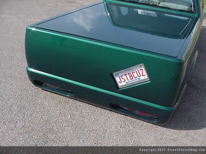 Starting in the rear, the taillights were shaved, as were the tailgate and tailgate handle, giving the rear a new smooth look. Completing the new look in the rear, Jason ditched the factory bumper and welded in a steel roll pan complete with Toyota Supra taillights and welded in a tilted license plate box.  The pair next shaved the gas door and relocated the filler next to the inner fender well.