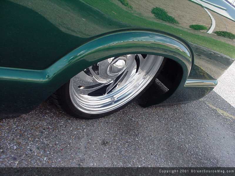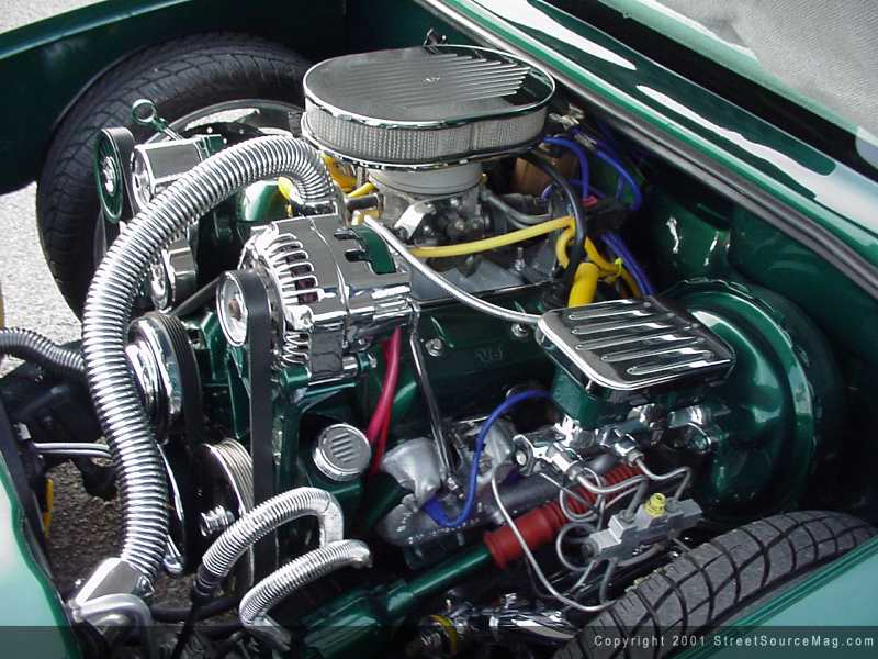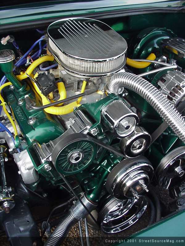 Finally, under the hood, Jason left nothing untouched. Here you'll find a completely smooth firewall and more chromed and painted goodies than you could possible imagine, including the block, valve covers, air cleaner, steering column, alternator and engine pullies. The battery was relocated to the bed to help clean up things under the hood as well.