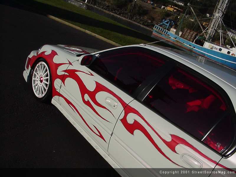 To highlight the colors used through out the car, Angie had made up her mind in having red window tint. After working over some minor exterior items and being happy with the completion, it was time to pick out the paint that would accompany the civic. Angie had made the decision to stick with a white and red theme from inside out. With help from Doug and Ben, Gabe began spraying down red pearl through out the already white paint.