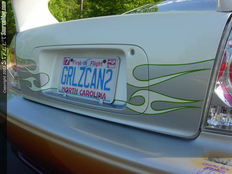 all trimmed in green hand painted pin striping. The graphics are wrap into the doorjambs to make the paint job a perfect one.   All the paint used was House of Kolor and was laid out by Randy Leonard from Dallas, NC. Rick Woods from Clover, SC is responsible for all the bodywork and prep before the paint could be laid. Summer also swapped out the factory taillights in favor of a set of euro clears as well as installed a set of clear front turn signals.