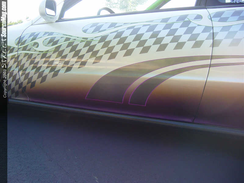 When you first see her car across the show field or rollin' down the road, you'll notice that it's not your average Prelude. The factory paint was sanded down and the door handles and emblem holes were welded up to make room the new custom paint job. Summer wanted a paint job that would be wild enough to impress the best judges, yet clean enough to not be too much. She chose a white base with a few shades of silver, orange and purple. She also had a fading checkerboard wrapped all the way around the car mixed in with white tribal flames