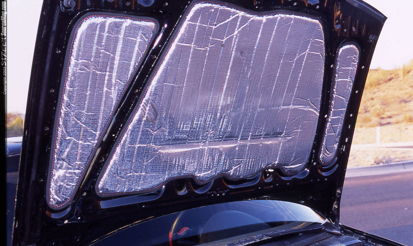 This was done to highlight all of the 12-volt stereo components and to clean up the engine bay. Next a 175-amp Wrangler alternator with custom machined brackets would be mounted. The alternator was added due to the hi-current demands from the outrageous system.  With the show circuit in mind, some custom built displays for under the hood would be laser cut out of Plexiglas to cover the power wire and distribution blocks. Finishing up under the hood would be a custom stitched black and red dynamate hood liner along with a Tenzo cold air intake.