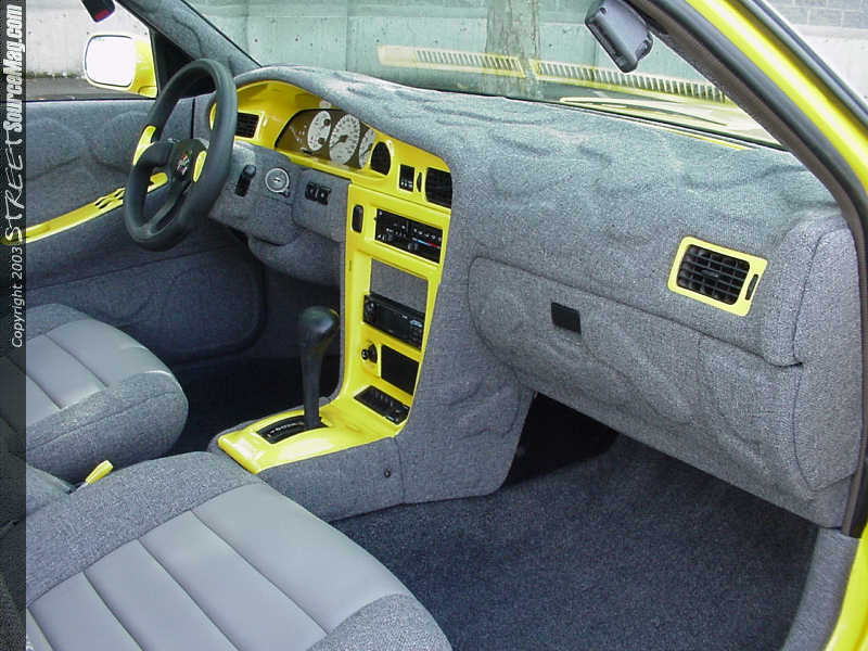 With the exterior complete it was time to bring things down to a much-improved level. The stock suspension would all be trashed and replaced by a set of refabbed Chassis Tech strut bags with fast valves to bring things up and down quickly. A front strut tower bar would also help keep things tight in the corners. Next the sub frame would be cleaned up and painted black. One more item at hand for the exterior would be the replacement for the exterior. A set of 18x8.5 Giovanna Barletta's, which have been wrapped in Yokohama Parada 225/40's would be Tom's choice of shoes. This would leave the interior to have reworked to Tom's standards. This would all be left to Jason Knauft of Bitchin' Stitchin', Spokane, WA. Jason would first start with the dash, which would be wrapped in graphite tweed along with yellow inserts. The doors would be done the same along with a coble stone look followed with a set of flames. Keeping things flowing, the headliner would receive the same attention. Other interior panels would be smoothed out and painted, including the rear deck.