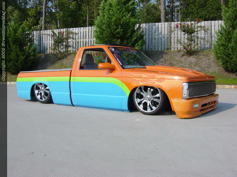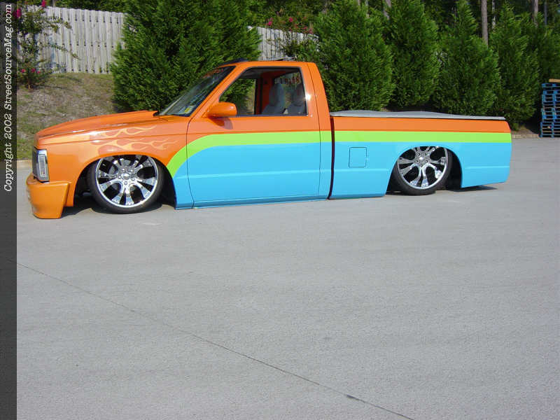 In order to stand out in a show field, the first thing you've got to have is an exterior that will catch everyone's eye. Mark has achieved this with his choice of bright colors and paint scheme. Before any of the paint was chosen, there were a few body mods and additions that were performed. The door handles, wiper cowl, emblems and taillights were all shaved.