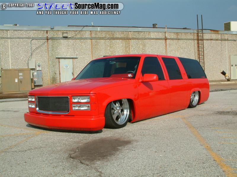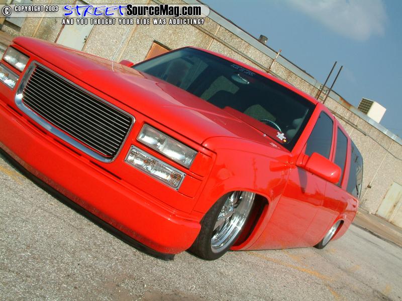 Jon started by calling his old friends Dacy Jackson and Brett Cox to get them sold on the idea that the Burban could be dragging body in as little as 10 days. So with them on board they began by taking the stock Burban that Jon had purchased from his mom and removing the entire front suspension. The factory coils were replaced with new Slam Specialties RS-72 bags. The factory spindles were then replaced with a drop spindle from Chassis Tech. Next they added a Monroe shock to the front to keep the ride as smooth at all times. Out back it was decided upon to cut the frame rails in favor of a C -notch to allow the frame and rearend to never have the ability to touch. The rear leafs were ditched in favor of a 2 link set up with a track bar installed to keep the rearend from shifting under extreme cornering. Another set of Slam Specialties RS-72's were installed in the rear to ensure plenty of lift. To ensure that the gas tank never had a chance to touch the ground Jon used the 20 Gallon donor of a Blazer, after it was powder coated to prevent it from rusting, and make it look better of course. To supply the pneumatic pressure the Burban needed to get things moving, (2) Viar 450 compressors were plumbed thru a 7-gallon tank. For that quick on the fly vertical motion Jon decided to install (8) GC Valves for individual corner control at all times.