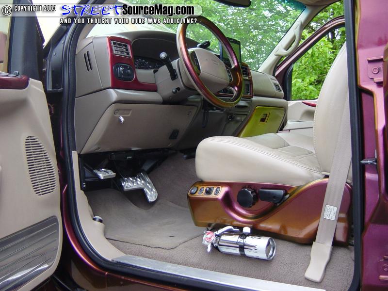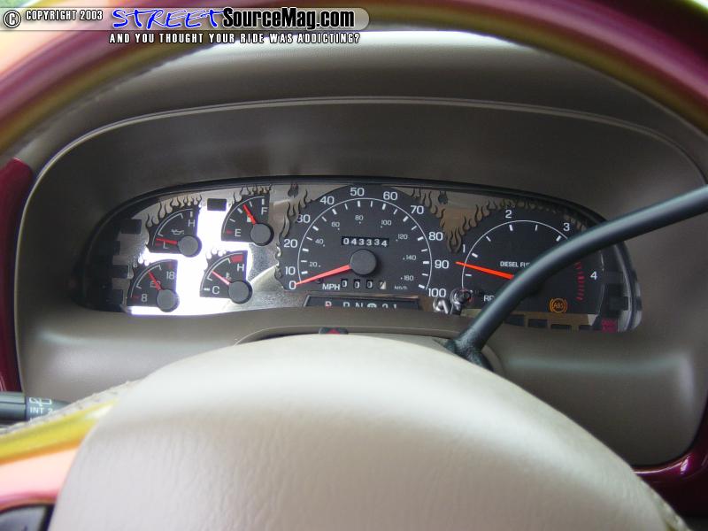 Now that the body was done, it was time to get the interior up to par. While the body was being painted, Paul took a few plastic pieces out of the interior and painted them to match. He also added a few billet pieces throughout the interior.   Being the truck came stock with leather seats, Paul decided to have T&C Upholstery out of Manassas, Virginia stitch some red tribal flames through out the center of all the seats.