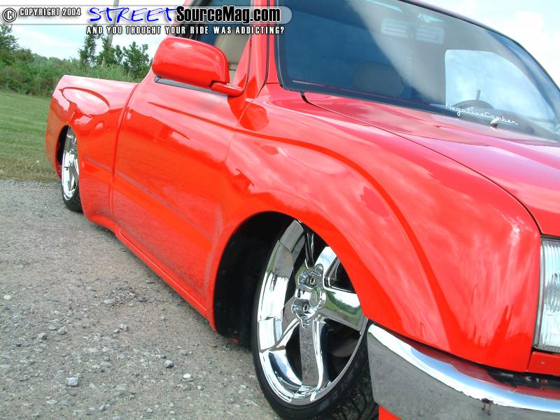 First showing his welding talents Jamey would work over the suspension along with help from Kevin Holland. The Toyota would be bagged at all 4 corners with 2600lb bags out back while 2500’s are placed upfront along with toxic shocks installed for a better ride.   A Pete and Jakes 4 link would then be installed into the rear taking the place of the stock leaf springs. When aired out the fenders were found engulfing the new 18/20 Boyd Coddington Rally billet wheel combo.