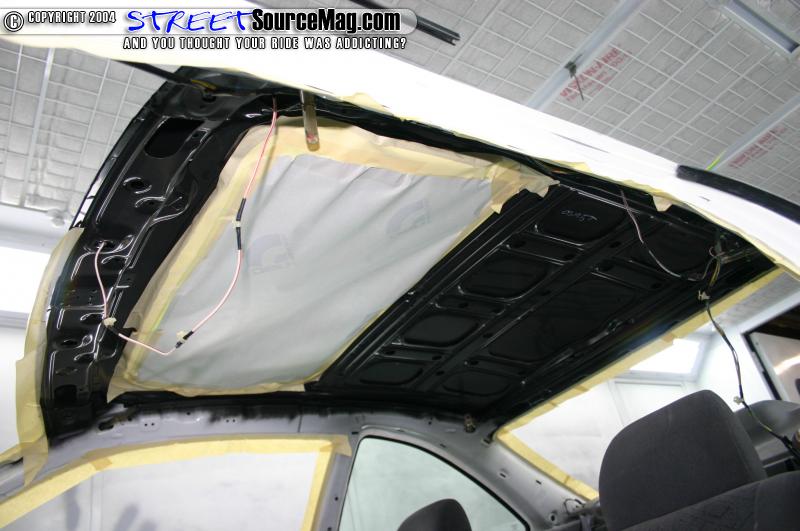 Next the car was pulled in the booth and taped up. After the car was prepped for sealer and paint I applied the seam sealer to the roof so that no water could leak in. After putting on my mask and mixing the paint I was ready to step into the booth. I first sprayed a few coats of Standox Sealer to the roof and let it dry. I then based out the roof with Dupont Taffeta white, and then cleared it with Dupont clear. The car was then baked. I wet sanded the roof with 2000 wet and buffed it so that it had a nice glass appearance. I then hand glazed my whole roof. The roof that I chose to use had factory sunroof in it. I reinstalled the sunroof, and attached the drain tunnels. I then called our friend Mike from Glasscar windows to reinstall the windows. After the windows were back in the car I put the interior back in and the car was now finished.