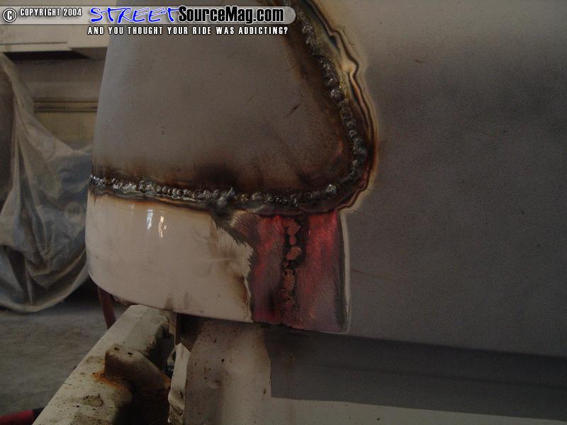 I then sanded all the metal fillers down with some 320 and Weld Sealed all of them until I was ready to weld them in so that they didn’t get surface rust on them while they sat. Next I popped my trunk and removed both of the tail lights which were held in by 4 10mm bolts on each side. The lights were then removed and I fitted my fillers. The fillers fit pretty good they only needed some adjustments. We started out by welding in the lower filler plate. Once that was welded in we moved on to the actual tail light filler and molded that to the quarter.
