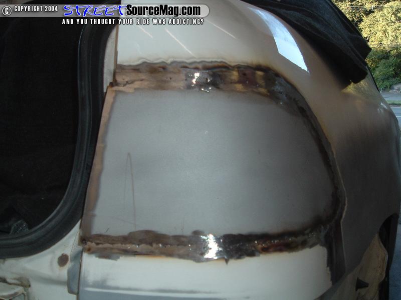 The whole area around the light and in the jamb was then sanded with 80grit sand paper. Next we applied a nice coat of Duraglass to each tail light. I waited for that to dry and block sanded it down with some 80, then 180, and last 320 until I had it were I wanted it. I then applied a layer of plastic over top of the Duraglass on each side. I hit it with 80 real quick to scuff off some of the heavy stuff, then sanded it through with 180 and 320. Make sure you feel the area around the light and the actual light to see if there are any waves in it. Sometimes from welding on the thin panels you can cause waves in the quarters. I was happy with the plastic work we had on there so we put 1 quick coat of skim coat to fill any pin holes that might come up later. That was sanded smooth with some 320 and then the tail lights were ready for prime. Inside the jamb I went a few steps ahead and grinded out the body panel seams then duraglassed and plasticed them until they were smoothed. I also filled the factory spot welds to give it a smoother look.