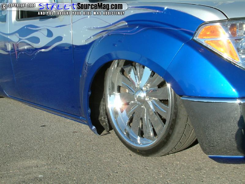 For starters a Suicidedoors.com reverse 4-link would be installed. Next two Viair 380 compressors, eight ½” E Valves 470’s, 4 Contitech 2600lb bags and two Chrome 5 gallon tanks would be set up and all ran with ½” hard line. Now having the ability to lay the body on the ground, the fenders would help tuck the 20x8.5 Boyd Coddington turbines wrapped in 225/35 Nitto rubber.