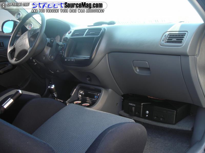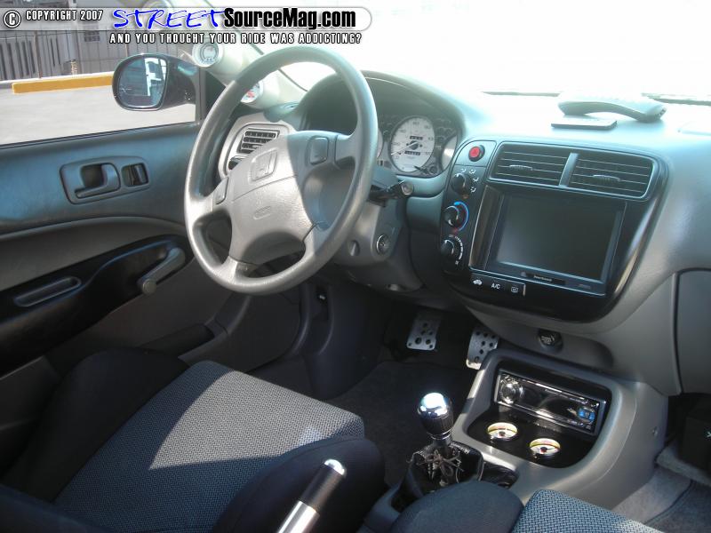 The custom work continues on into the interior. Black and gray Tenzo R racing seats were put in place of the boring stockers. The rear seat and doors were then upholstered to match and CIVIC embroidered into the backseat. Brad then installed a Panasonic CD player along with Audiobahn AW12002 subs and Pioneer mids and highs. Powering this setup is a 12001DT Audiobahn amp and Stinger battery.