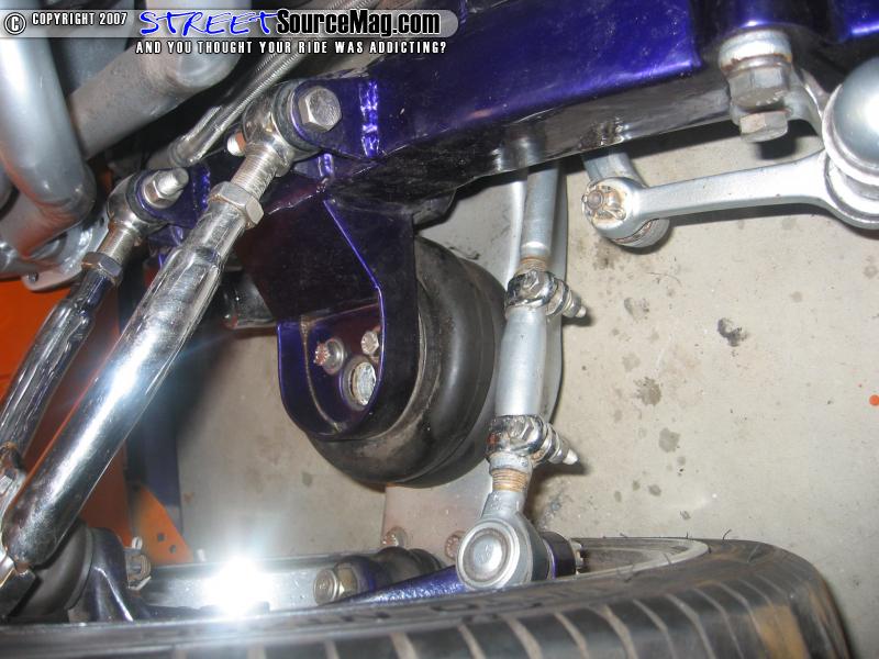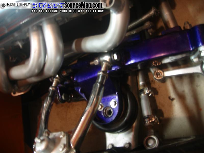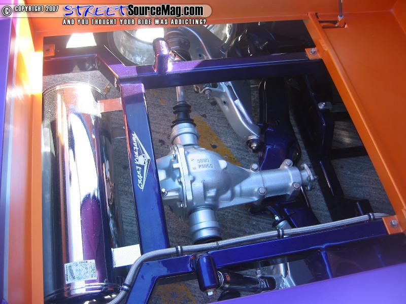 Starting with the chassis Ryan would utilize 2x3-boxed tubing for a custom frame for a stock floor body dropped appearance. The frame would then be powder-coated candy purple. Next a 300z rear end would be set into place. Next Ryan would install a set of tubular upper control arms, Slam Bags at all 4 corners, all stainless hardware, 9-gallon chrome tank and 2 Viar 450s. Having everything set into place Ryan would then have all of the suspension either painted VW silver metallic or chrome plated. With the body now flat on the ground the fenders would welcome in the new 18-inch KMC Guidos wrapped in Nitto 215/35zr18.