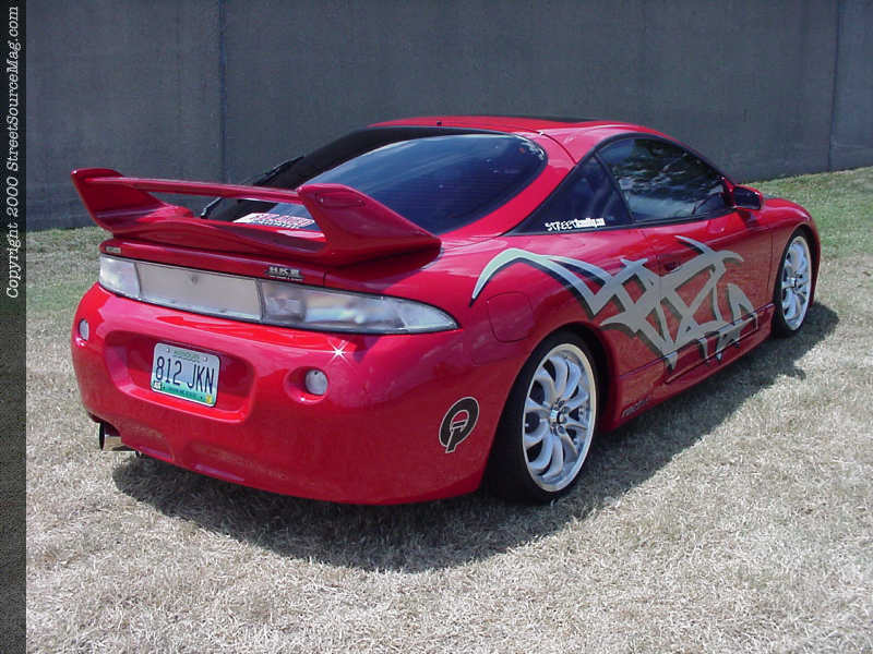 The body of Coby’s Eclipse was next on the agenda. First, Coby bolted on a VIS Racing carbon fiber hood. Next, an Erabuni GTR wing was put in place and APC clear bumper lights and APC clear taillights were installed. Next, Syndicate Graphix was called upon to create a set of black and silver tribal graphics to go over the stock radiant fire red paint.