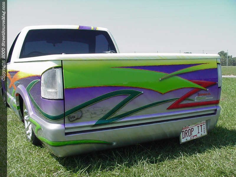 Next, Rob’s S-10 was taken to Dennis Virgil of St. Louis, Missouri to get the wild graphics laid down. Utilizing 41 different colors, Dennis went to work painting in a total of 120 hidden skulls, in the mix of all the tribal graphics and flames. Also within the graphics you’ll find Cheetah print, snakeskin and water tide swirls. Dollar signs also can be found within the graphics. What really sets off Rob’s S-10 is the fact that this truck is double sided. The graphics are different on each side, which allows you to look at it closely for hours to see all the visible and hidden graphics. The graphics also were painted between the cab and bed for a true custom job.