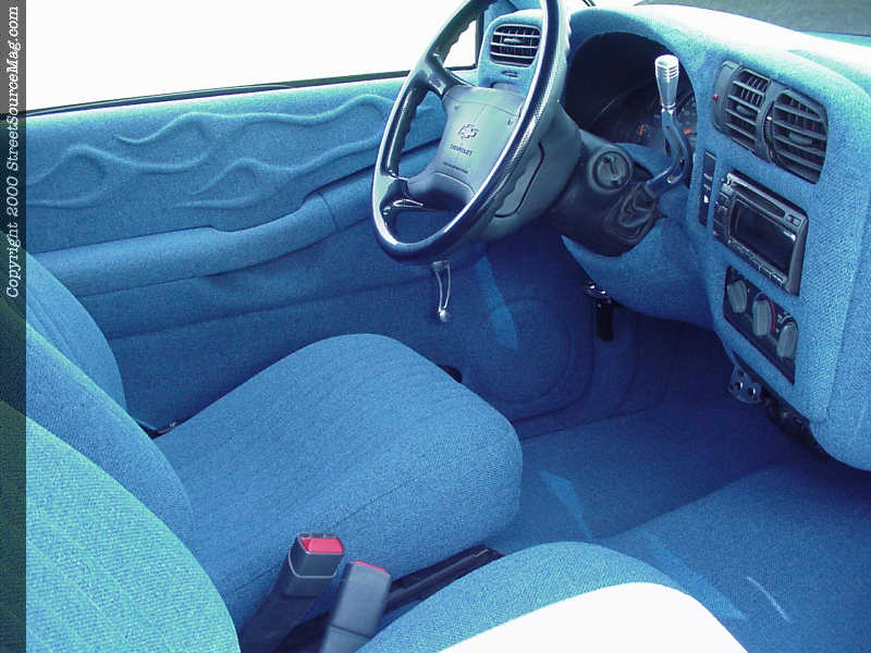 After the wild graphics were laid out, Easy Ed came in to add painted pin striping throughout the graphics. Other exterior features on Rob’s S-10 include blue headlight bulbs and clear corners. The taillights are also clear. With the graphics finally complete, Rob moved to his interior to give it a full show look. Jeff Hamilton removed the headrests and reshaped Rob’s ’97 Grand Am GT seats then covered them in Academy Blue tweed. Rob then covered the headliner and stock dash in the same color tweed and added many billet inserts for accent. Rob and Art Gordon have covered many other things in tweed. Next, Rob installed a custom stereo for sound while he’s cruising. Rob started everything off with a Pioneer graphical stereo and using MTX amp, gets the sounds throughout the cab using JL Audio speakers. Finishing off things, a Grant carbon fiber steering wheel was bolted up.