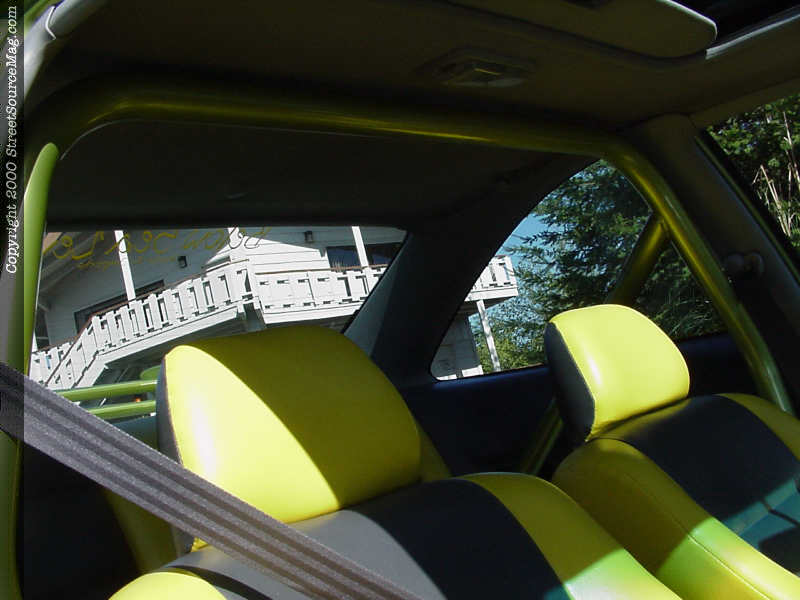 | The color matched rollcage is always a bonus when it comes to the show scene. | Also to add the import feel to the interior, Angi had a Cold Rolled steel 3” roll cage installed along with AutoMeter gauges. To bring sound to the drive home, the decision was to go with a JVC kameleon CD player with Alpine mids and tweets.