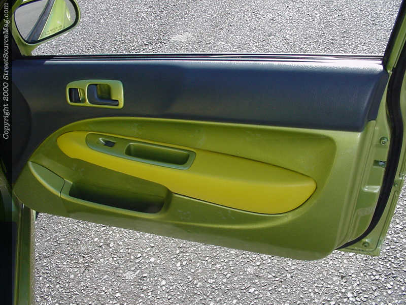 To bring this phat Civic to the eye grabbing attention it deserves, Angi turned to Justin Jones of Redding California to spray down the Sherman Williams electric metallic green paint. Angi’s husband Gabe lended a helping hand with the paintwork as well. While the car was with Justin, they decided to airbrush some ghost skulls into the scallops on the hood along with the door panels. To finish off the outer look Angi went with clear taillights and headlights.   | Even equipped with a Carbon Fiber emblem! | Now since the car was grabbing attention driving down the road, it was time to impress those taking a peak inside. Carbon Fiber inlay’s with custom paint are found within’ the interior along with a Momo steering wheel. The front and rear seats where covered in yellow and gray vinyl seats, which were done by Robs Upholstery in red bluff California.