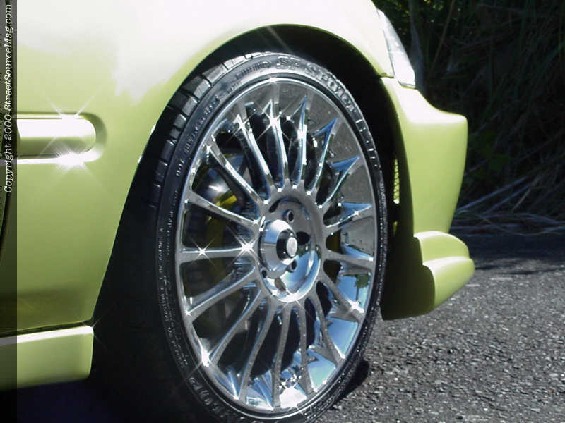 To roll the civic around, Angi went with a set of chrome ICW 17” wheels wrapped in 205x40 rubber. Since the import scene is big on speed, Angi knew she wouldn’t be able to leave the engine alone. So to move the civic down the road it was time to hook up the engine. With this in mind many add-ons were required. To get things started AEM adjustable cam gears were installed. To get the air flowing, the decision was to go with DC Sports 2 1/4 –inch cat back system along with a DC Sports Header.