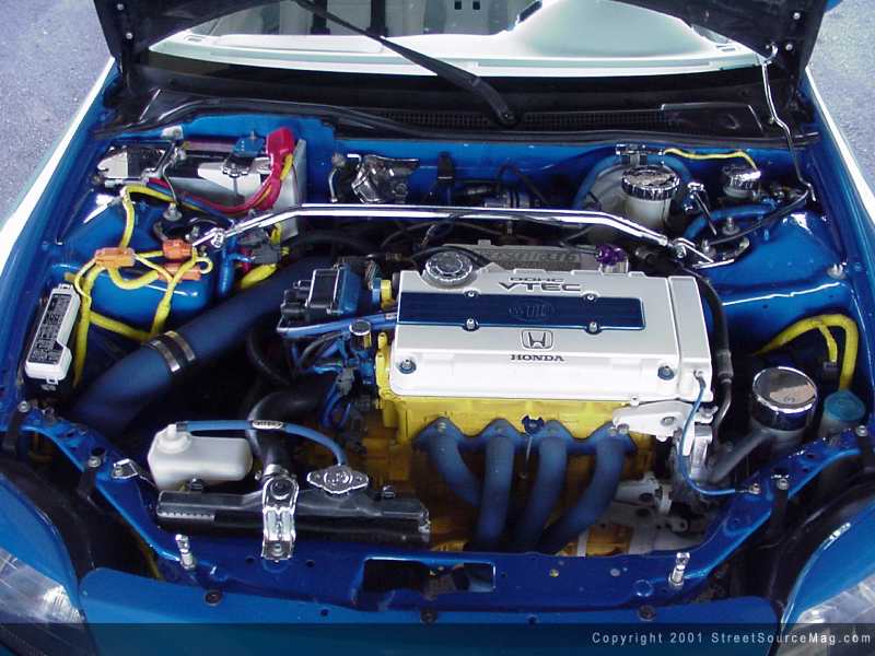 Everything almost complete, Donald knew the power plant about ready to be put in would be in need of stopping ability with quick response. Utilizing crossed drilled rotors front and rear; Donald would be able to stop pretty much on a dime at any speed. Goodridge steel braided brake lines would supply the new brake set up with the fluid needed. With handling performance no longer an issue, and the suspension bringing the body of the Sol down to meet with the 17x7 Racing hart C2 wheels snuggled in 205/40 Toyo Proxes, it was time to move to the engine bay. The engine usually found amongst the Del Sol is one of pep. Not usually shy of taking out competition on the streets, Donald had better and faster ideas in mind. With friend Mark Ramirez being a Honda/Acura technician, the list of modifications would be a task easily taken on.