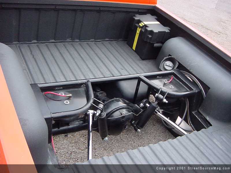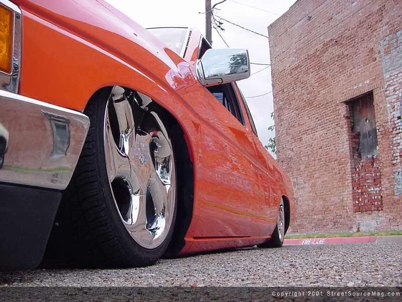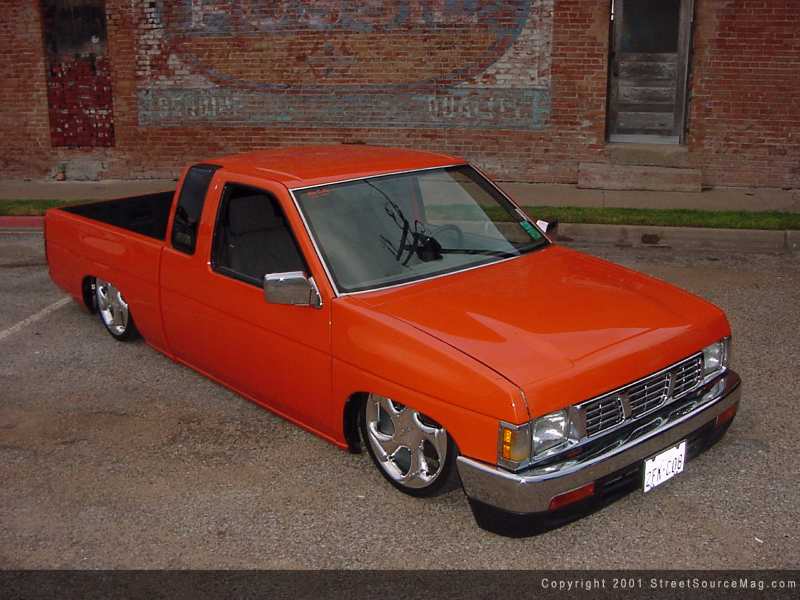 On a nice cool day in Jan of 92 David dropped a cool 10k to make this 91 Nissan his own, after 3 years of daily driving and a nicely figured build up price David was finally finished building this hard body to debut at the 95' Heat wave. Being in this sport for 13 years you can learn a thing or two on how to cut corners and make building a truck a whole hell of a lot easier. Some of David's previous rides consist of an 89 Mazda, 77-ford currier and a 92 Chevy suburban on dubz. But David's main reason for building this sweet ride was due to a little peer pressure and the thought of seeing it on the pages of this well-established magazine. (Ok, maybe not just this magazine but to see it in as many as possible) In the process of building this truck David let fellow club member and friend Rob Rodell at Under Ground Customz perform all the suspension work. Up front of this mean bastard Rob installed 2" drop spindles and firestone airbags, with the shocks and tie-bar relocated Rob and David went the extra step of redrilling the front hubs to convert the 6-lug bolt pattern to a 5. With the front end layed down it was time to head to the rear.