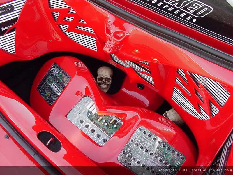 With most of the interior chores complete, Robbie visited an old friend again, Stereotypes, for a complete stereo package that would kill the competition. Starting at the dash, the crew at Stereotypes installed an Eclipse 55430 CD head unit.  Five Mark Antony amps provide power to a custom built box, complete with strobes, neon, and an Alien skull molded in, with LED eyes. Two EQT's from Audio Control keep the sounds going to their perspective places throughout Robbie's ride.