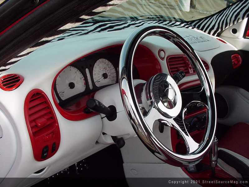 The center console was also dyed red and white and outfitted with black tweed and Zebra skin print.   Billet Accessories Direct provided a one-off billet steering wheel and custom-made white face gauges adorn the dash of Robbie's Alero. Also adding appeal to the dash, the vents were removed and painted Fire red to match.