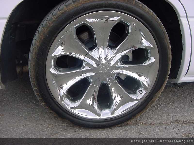 20x9 Detadas all the way around with BFG rubbers were slapped on to give the Bling Bling appearance. Moving to the engine Craig pretty much left the "stock" look, but added a cool 150 shot of nitrous to amaze the speed freaks. Along with the nitrous Craig added a K&N generation 2 power aid and throttle body spacer to boost the horsepower up a hair.
