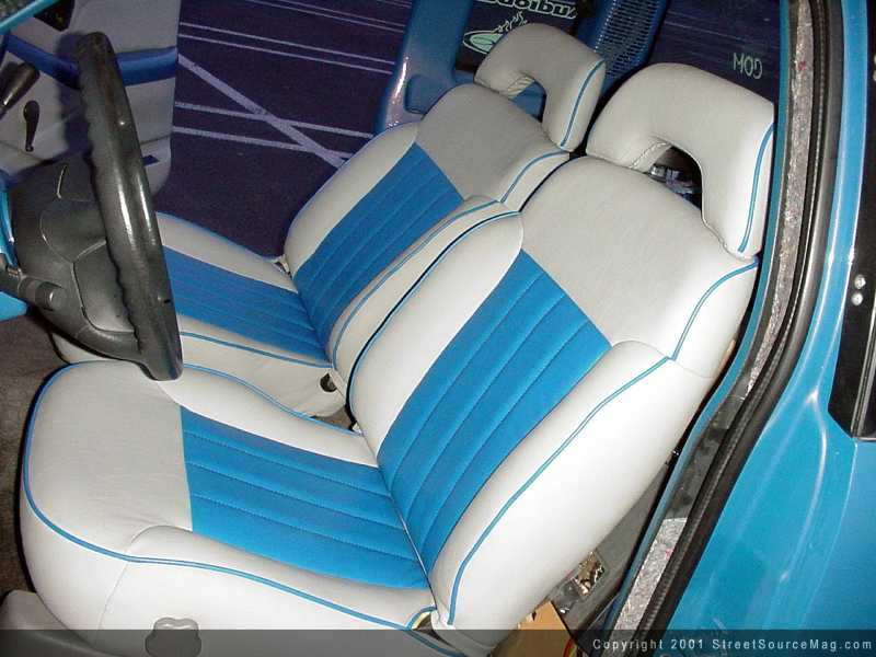 With the dash, door panels and headliner all being wrapped in tweed material, it would only be fitting that the seats would be done the same.  To give off a little extra, the center of the seats would have a vinyl material stitched in. All other panels would also be wrapped or painted with the same blue and orange pearl to match.