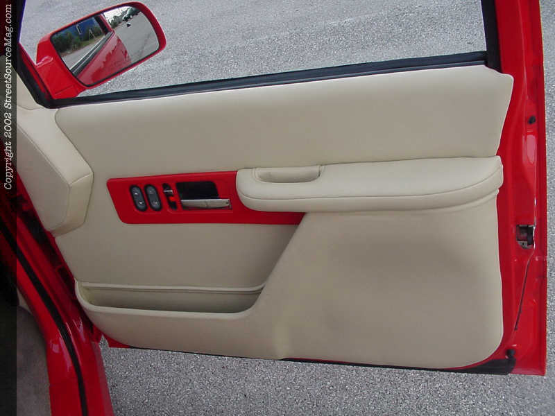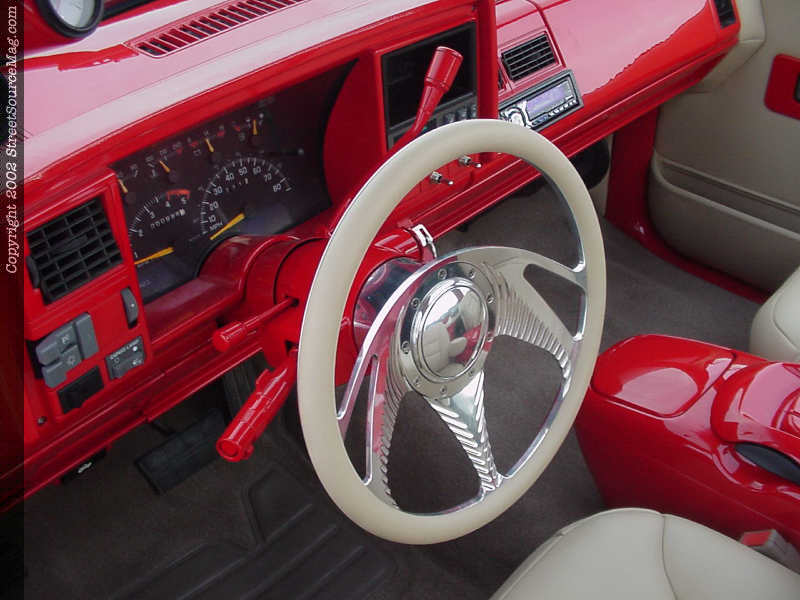 All other interior panels where painted red to match the dash and to bring everything together. Wanting new seats, Jimmy would install a set out of a 1998 Tahoe. The seats would be installed and reupholstered in the same ultra tan leather along with the head rests being removed. The seats where stitched up by Tracey Morris of Pocola, OK. The stock steering wheel was then replaced with one that was supplied by Budnik to help finish things out.