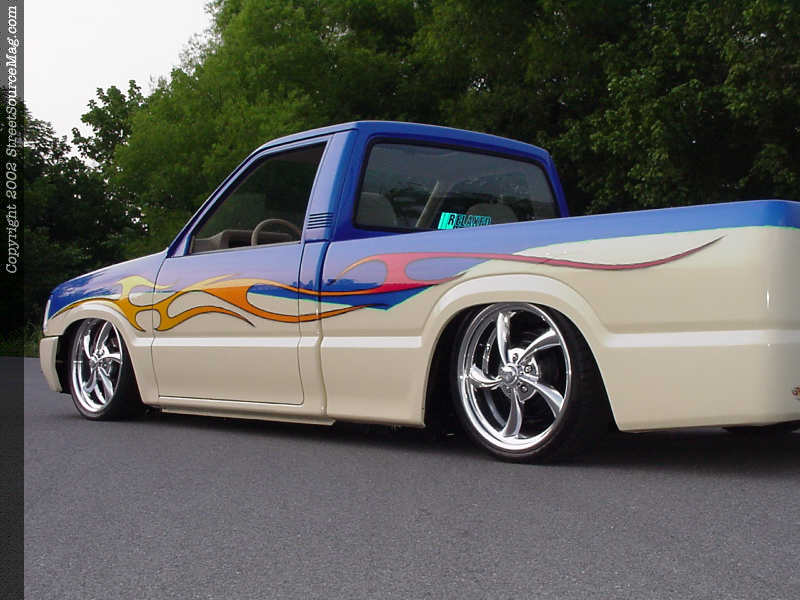 With everything shaved and smoothed to Andrew's tastes, he delivered his truck to Denny Phillips of Meridian, Mississippi for color. Denny first applied the House Of Kolor Trublue and cream two-tone, then gave the Mazda more life with House Of Kolor Magenta Pearl and Sunrise Pearls flames. Denny the used a shade of green to pinstripe and bring life into the color scheme. Generous amounts of clear were then sprayed and Andrew's Mazda was finally starting to take shape.