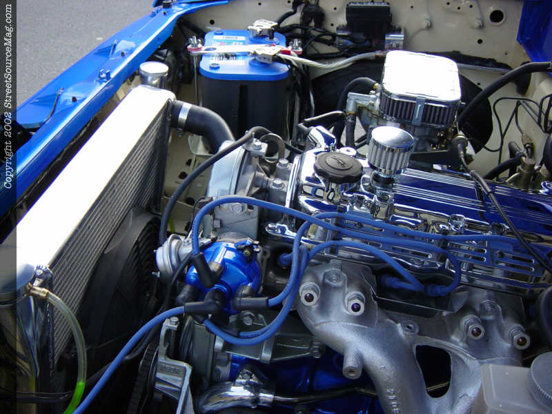 Almost near completion, Andrew focused under the hood of his Mazda. First, the firewall was sandblasted and two-toned to match the exterior. Next, the block was painted House Of Kolor Trublue. Andrew had the valve cover chromed and installed a Weber carburator.  The factory radiator was removed and replaced with an Afco aluminum model, helping to keep the Mazda running cooler on those hot Mississippi summer days. The unsightly plastic overflow tank was trashed and replaced with a shiny new billet model. The exhaust duties come from a high-flow Flowmaster system. Finally, Andrew installed an Optima blue top battery, to match his now completed Mazda.