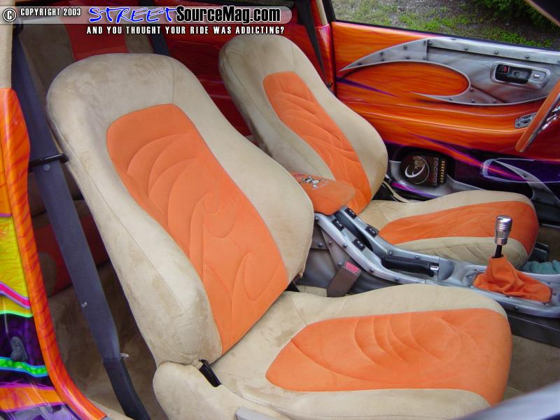 Now that Jonathans Type R had a paint job that could take on ANY paint job in the scene, it was time to make the interior match. The seats, headliner and floorboard were all stripped in favor or a new coating of tan and orange suede.
