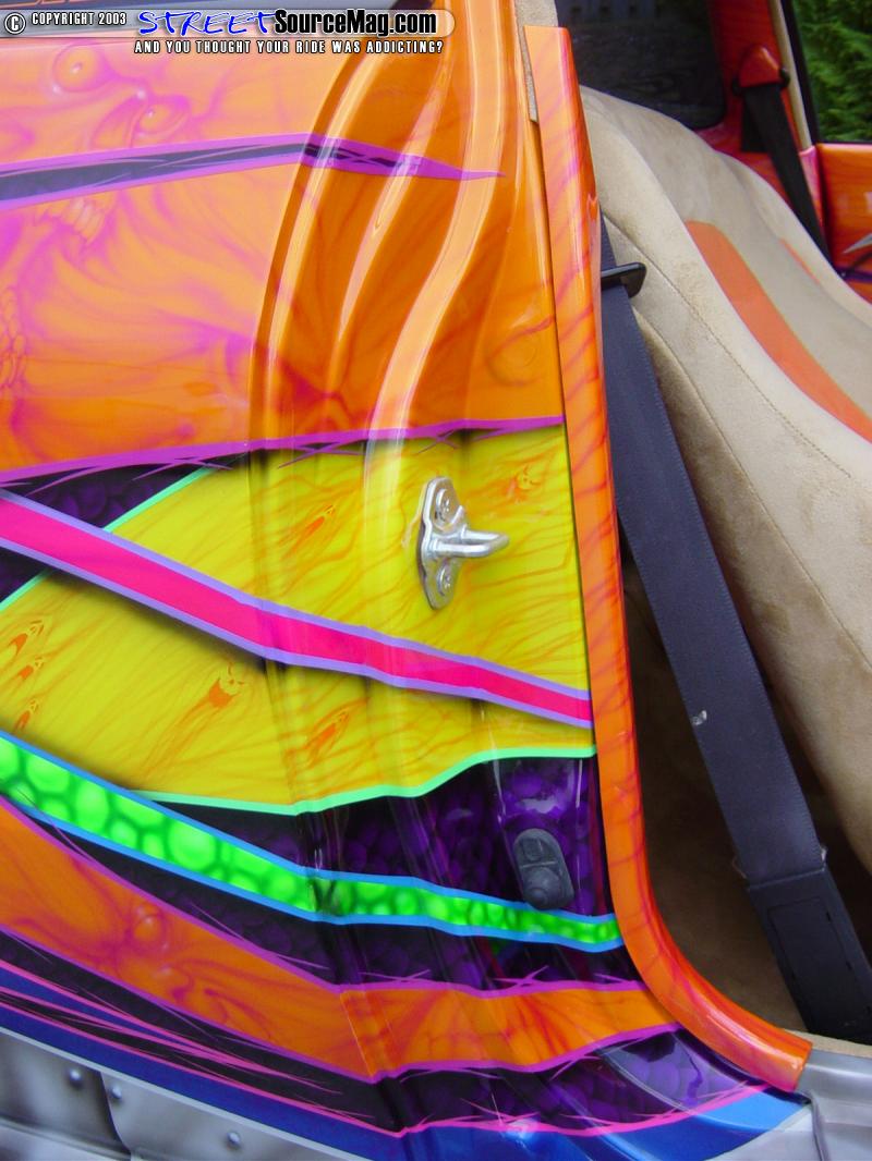 The graphics flow perfectly from outside, through the doorjambs and into the interior. The graphics coming up the hood flow nonstop across the dash as well. There were also a few pieces painted like armor plate to match the armor plate paint on the bottom of the car.