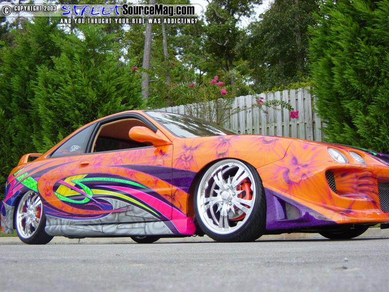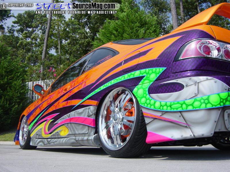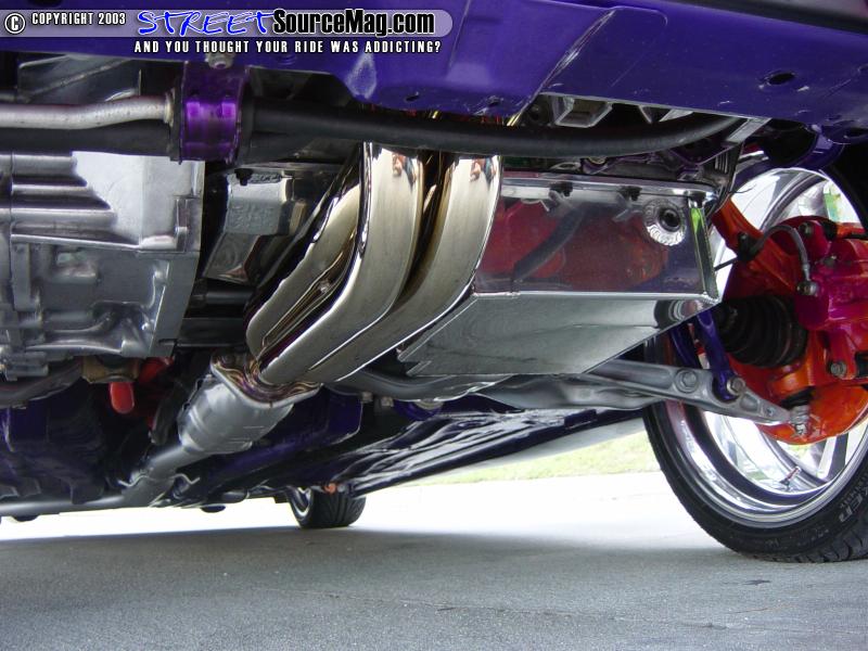 Now here is where Jonathan REALLY set his car apart from the rest. Most people would stop here and decide the car was ready to show, but not Jonathan. In order to guarantee he would bring home several best of show awards, he decided to carry the paint scheme to the entire undercarriage of the car. The entire unibody and sub frame were stripped and painted purple with orange accents. The gas tank was painted like sheet metal screwed together. The sway bars were powder coated before they were reinstalled. Every bolt on the undercarriage was coated and reinstalled. This shows that Jonathan went the extra mile not to leave ANY bolt on his car untouched. Now after looking at a car like this you would assume it's a trailer queen. That's not totally true in this case.