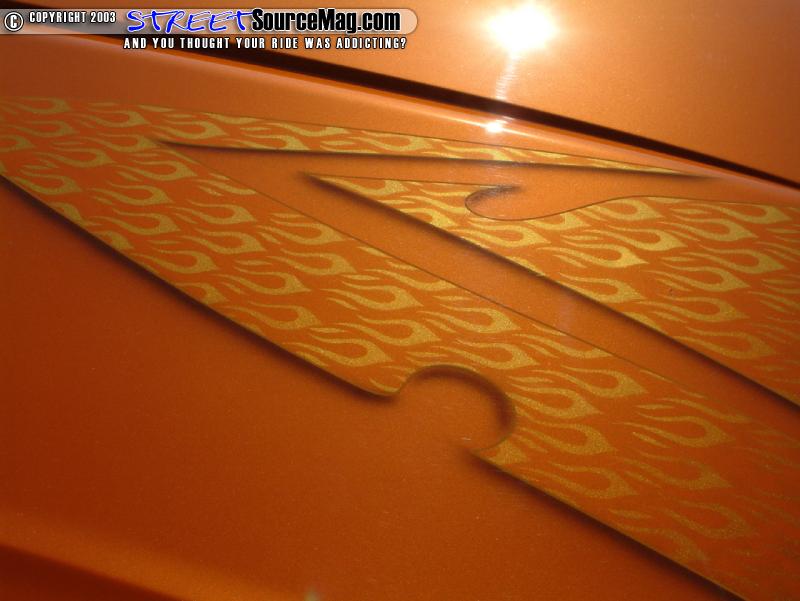 The paint would be laid down by Cory Pentecost and Jason Light of Fast n' Nasty Paintwerx. To add a little something extra, they would through a Tribal design onto the hood using an array of colors that change to magenta along with orange pin stripping.