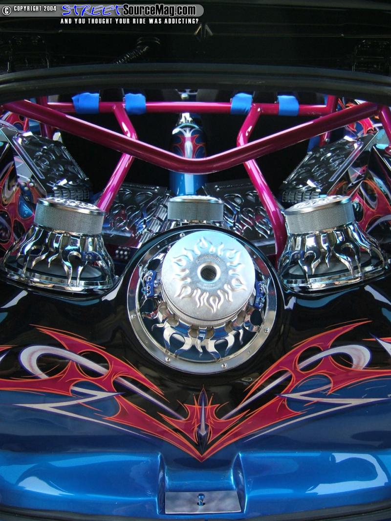 Next a fully fiberglassed dash would be set into place along with door panels, rear cargo area (which involved glassing where the rear seats where located) and a custom painted roll cage. Specialty Designs billet doorsills and center dash inserts would also be installed. Not yet complete Kyle would install a full Audiobahn Flame Series Stereo Setup in a custom fiberglass enclosure painted to match the exterior graphics.