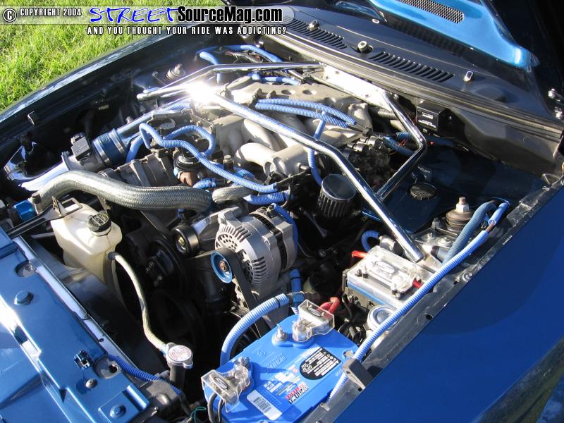 The engine would remain mostly a stock V6. To bring the custom work through out, a BBK chrome intake, BBK chrome strut brace, Optima blue top battery along with many other painted pieces and billet dress ups through out.