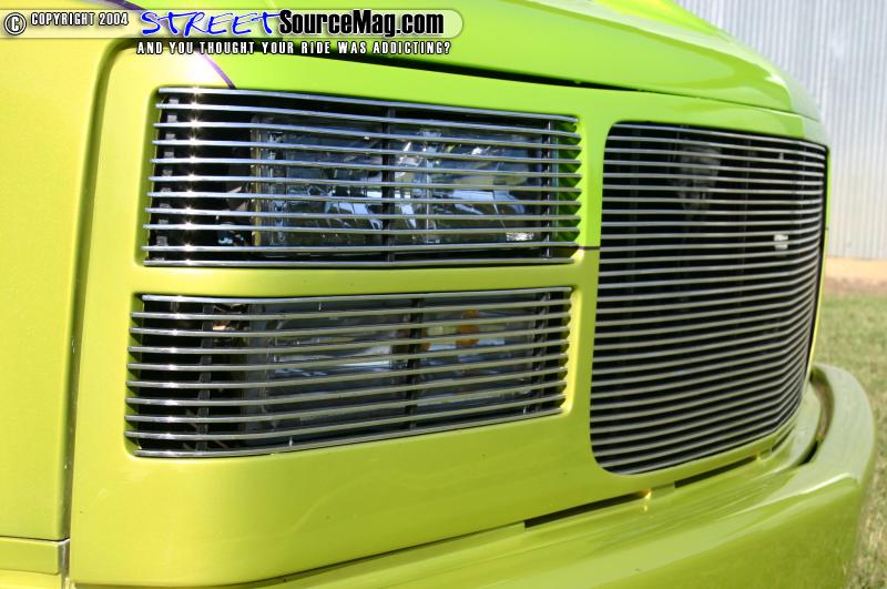 Starting with the exterior of the truck Mark knew that there was an extensive amount of bodywork that would need to be completed. Starting at the front of the truck Mark tossed the stock hood and slapped on a Ram Air II hood, and underneath it a Trenz 30 bar billet phantom grille was installed. The door handles were shaved as well as the inner fenders and body seams.