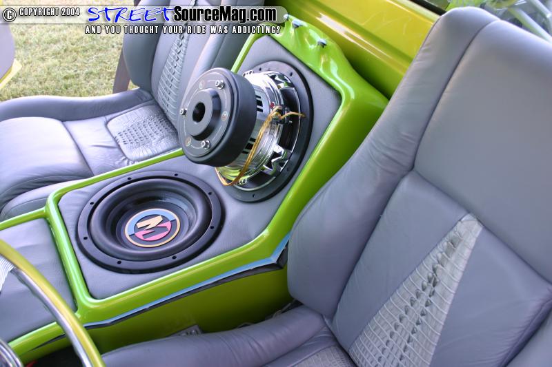 The seats are out of a Fiero and are wrapped in gray gator and leather. Coachworks did all the wrapping. Marks interior also features a Billet Specialties steering wheel, Trenz billet mirror, bullet hot rod vents, and a custom fiberglass console housing the switches and amp. The stereo consists of a Pioneer head unit, Boston Acoustics mids and highs, two 10” Memphis Audio M3 subs, and a Soundstream class D amp.