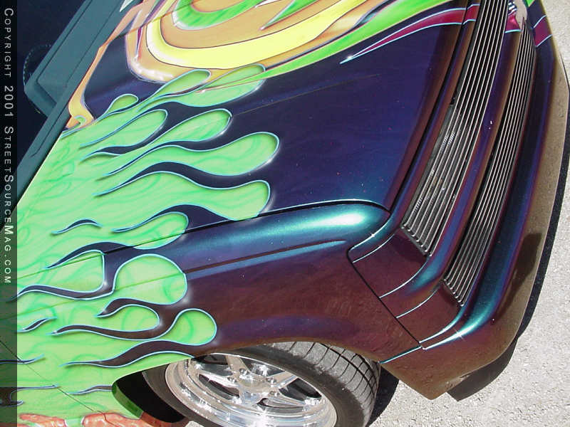 So after dramatic changes in life, it was time to take the truck to new standards for all to follow. To accomplish this, Tom relied on the professionals of Maxed Out Paintworx of Houston TX. The first thing at hand would be to bolt up a Cowl hood to give the front some attitude. Next, the front bumper was sectioned 4 inches and recessed an additional 2 inches to give the front an even smoother look. To complement the bumper work, a Precision billet grille was installed.