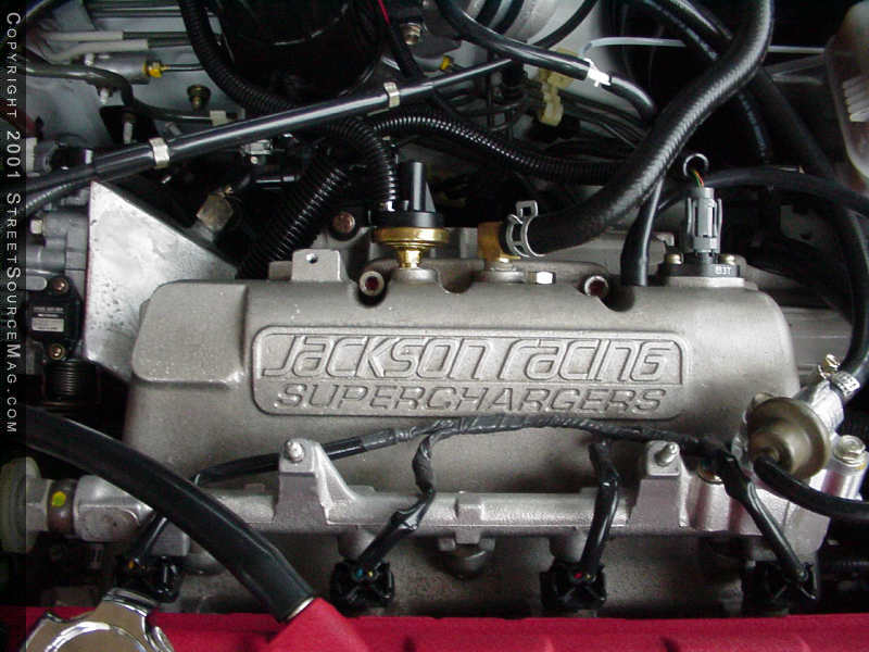 With the additions of adjustable cam gears Ryan would be able to help tune the engine for max power out of his Jackson Racing supercharger, which provides up to 8 PSI. With the help of Jesse Munoz installing the supercharger, the correct tuning for ultimate power was brought forth.  Now to help the engine breath, the choice was to bolt up a Kamikaze header, along with a Tanabe R Medallion stainless steel exhaust and muffler.