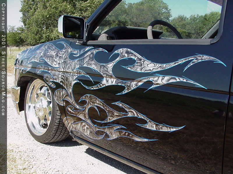 One of the first steps Brian had in mind for his mini would be to lay the stance down to huge mother earth. In order to accomplish this feat Brian would need to turn to Sean Thurman of Lewisville TX for help. While in Sean’s hands, the rear frame was notched and a custom 4-link was made and installed. To get everything to lay smoothly to the ground, Sean also constructed tubular cross-members throughout to replace the stock bulky ones. The next step would be to install a set of Doestech shocks up front along with bagging all four-corners for adjustability on the fly. Brian’s decision to work the body would be one of strategic planning. To give the ’92 Hardbody a newer look, Brian decided to bolt up a ’96 hood along with a set of ’96 pathfinder fenders.
