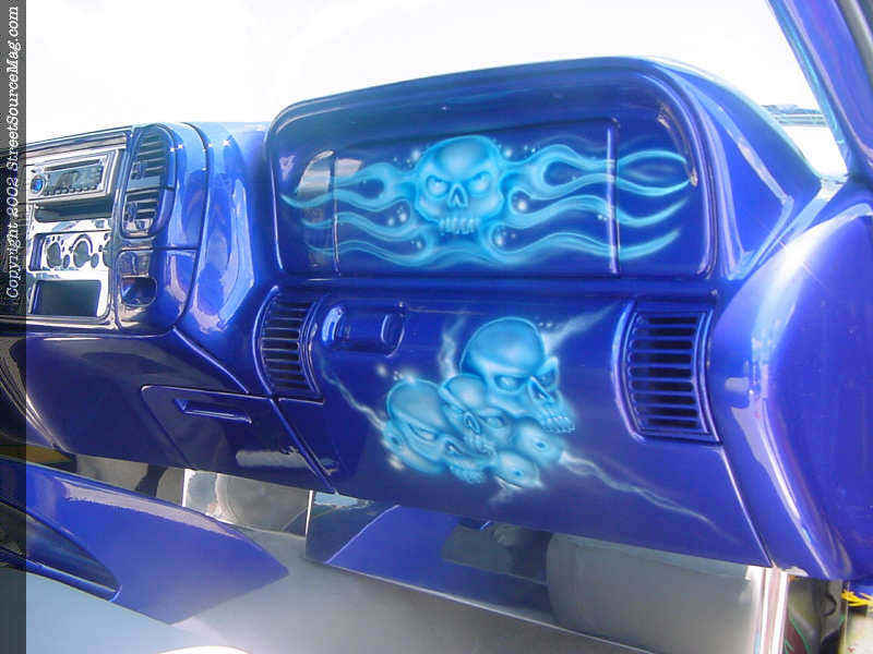 As for the interior it is just as rad as the exterior. Jason took the door panels, dash and even the headliner and fiber glassed them smooth. With those parts smoothed out, he then had the painters match the exterior graphics exactly with the interior.