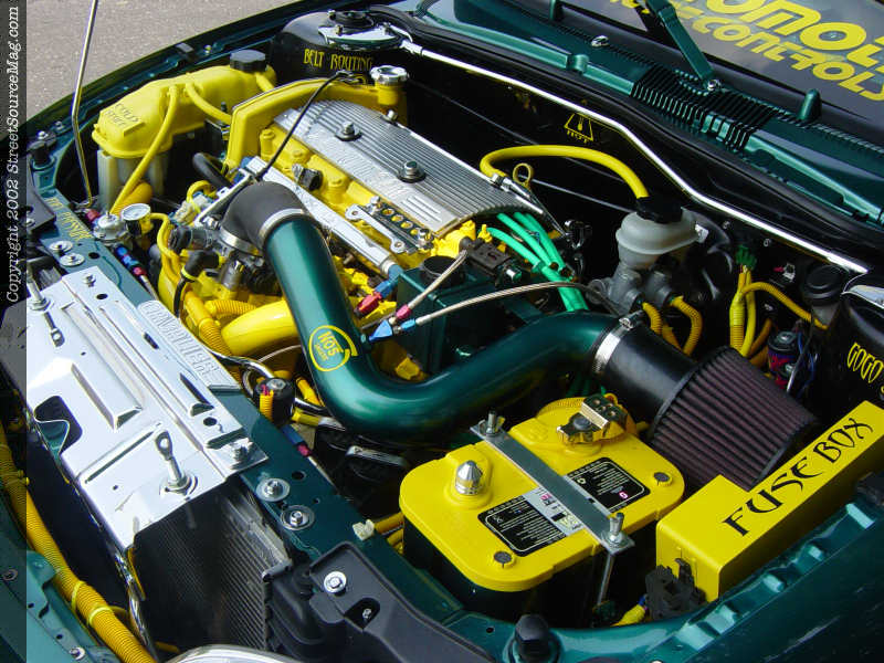 Now that Chris was happy with the look, both inside and out of his car, it was time to give it that extra little power needed to get it going. He knew exactly what he wanted before he even removed the first bolt from his engine. So after gathering all the needed parts it was time to completely tear down this mild mannered Cavalier and make it a full out (street legal) racecar, yet clean enough to still win at shows. The factory 2.4 liter wasn't going to be big enough to handle all the parts Chris had planned for the car so the engine was bumped up to a 2.5 liter. The engine has been ported and polished with JE 9.5 to 1 pistons, HD lifters and MantaPart cams. Chris has also installed under drive pullies and a 180-amp alternator to go along with his new MantaPart timing chain.  To make sure the engine gets enough fuel, a Venom fuel rail and RC Injectors were used. To round out the list of HP goodies, there is an AEM intake on a MantaPart throttle bottle, Electromotive ECU, Holly fuel pump and an AEM fuel pressure regulator. He also chose MantaPart motor mounts so they could handle all the torque the new motor mods would produce.
