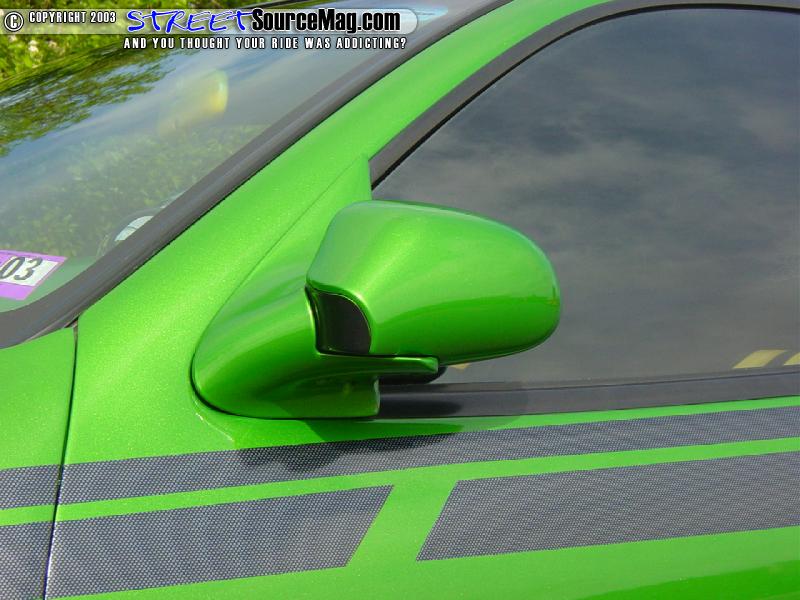 Sounds weird, but over in Japan, this car is a Toyota Cavalier and just like a Honda, they have parts on them that we don't have here. The mirrors he added fold in like most of the imports out today. The factory ones were solid units.   Chris has also added a ton of carbon fiber to the body of his car. These parts include door handles, trunk plate, wing and front and rear splitters. Once the body was prepped and ready for paint, it was time to lay down the 3 stage custom mixed shade of green.