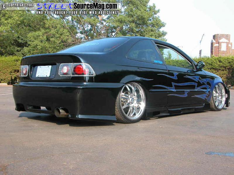 Gotta get rid of any dimples, so she also shaved them all - well, the door handles, antenna, wing, and emblems that is to create a much smoother and cleaner look. To complete this $25, 000 dollar look the crew at Custom Concepts in Oklahoma City slathered the beauty in Black Flamingo Pearl and accented the Honda's new features with Blue Marble tribal graphics.