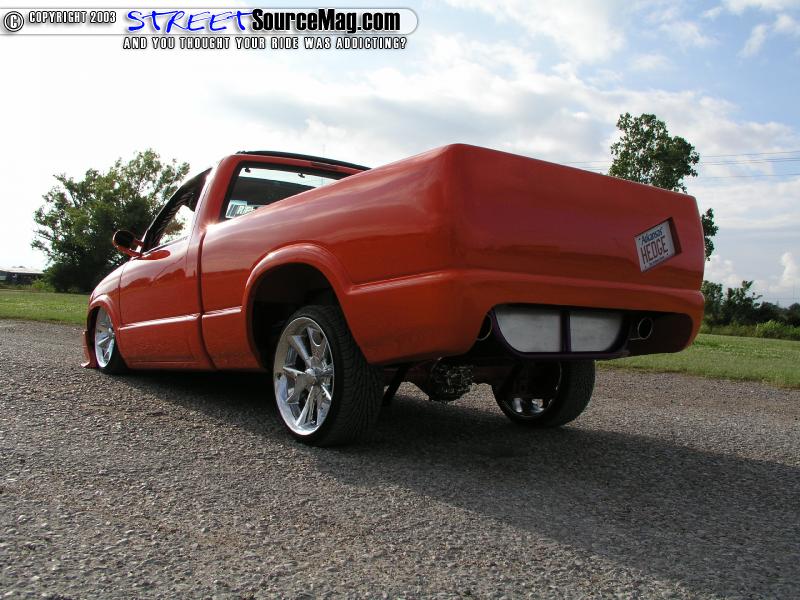 Dustin picked up his 94 Chevy S-10 for a mere $1500.00 back in 1999. After taking ownership Dustin knew that this was not going to be another average truck so he decided to go all out and start big. The first order of business was to set the frame on the ground. Dustin first ditched the factory front coils in favor of a Firestone airspring mated with a BellTech 2" lowering spindle to set the front crossmember flat on the ground.